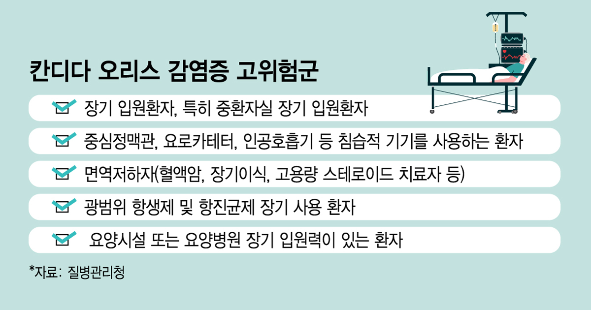 그렇다면 감염 시 어떤 증상이 나타날까. 건강한 사람은 이 균에 감염되더라도 증상·징후가 나타나지 않을 수 있다. 하지만 면역이 떨어진 환자가 이 균에 감염되면 △귀 감염 △상처감염 △패혈증을 초래하는 혈류감염 △발열 △통증 △피로 등 증상이 나타날 수 있다. WHO에 따르면 칸디다 오리스 진균으로 인한 침습성 칸디다증의 사망률은 29~53%다.