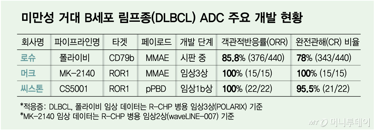 현재 DLBCL을 적응증으로 상업화된 ADC는 로슈의 '폴라이비', ADC테라퓨틱스의 '진론타', 다케다의 '애드세트리스' 등이 있다. 그중 1차 치료제로 승인받은 폴라이비는 CD79b를 타겟하며, MMAE 계열 페이로드가 사용됐다. 폴라이비는 R-CHP(리툭시맙·사이클로포스파미드·독소루비신·프레드니손) 병용요법 임상 3상에서 ORR 85.5%, CR 78%를 나타냈다. 3등급 이상의 치료 관련 이상반응(TRAE)은 60.7%(435명 중 264명)다.
