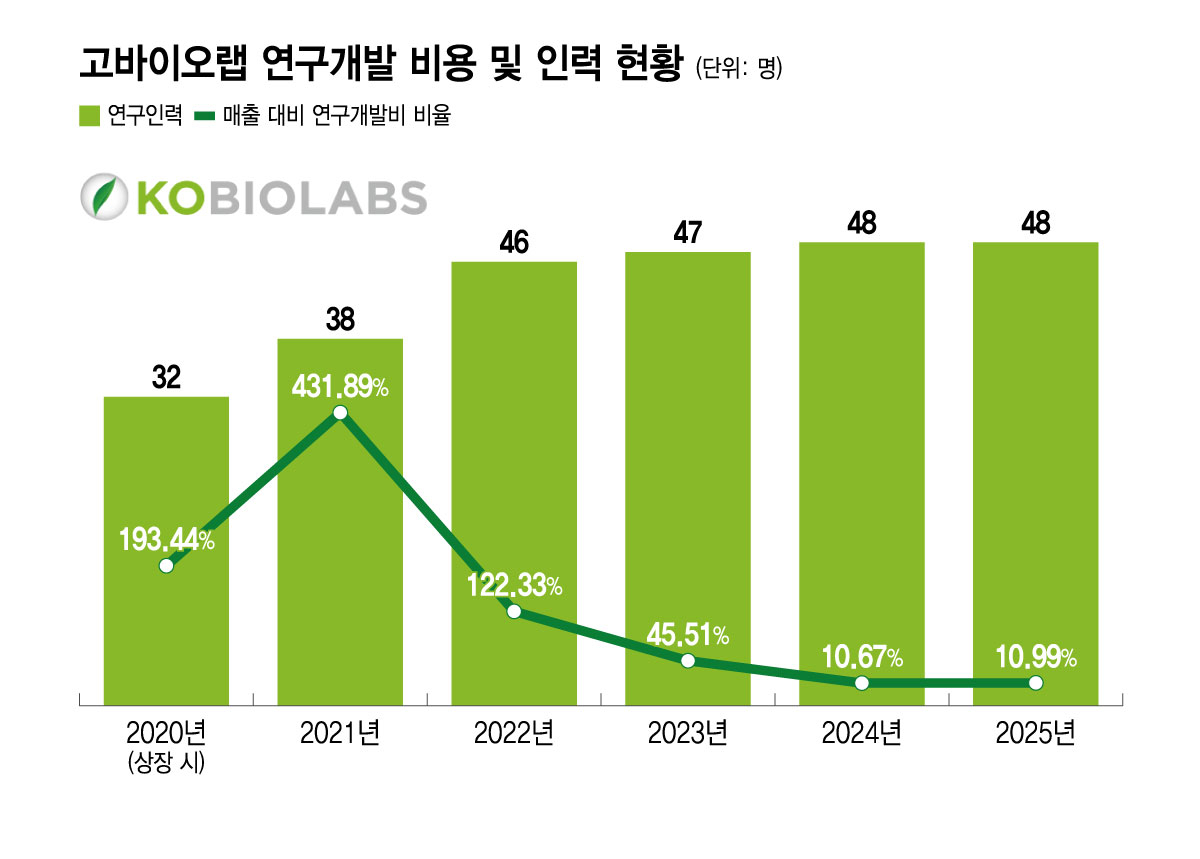 다만 고바이오랩의 매출액 대비 연구개발비 비율은 감소세다. 이는 건강기능식품을 중심으로 매출이 늘어나고 있는 가운데 2023년 이후로는 대규모 자금이 투입되는 임상이 이뤄지지 않은 데 따른 것으로 풀이된다. 고바이오랩은 2023년 7월 궤양성 대장염 신약 'KBL697'의 미국 및 국내 임상 2a상을 자진 취하한 바 있다. 고바이오랩은 현재 조기 기술이전 사업모델에 무게를 두고 있다.