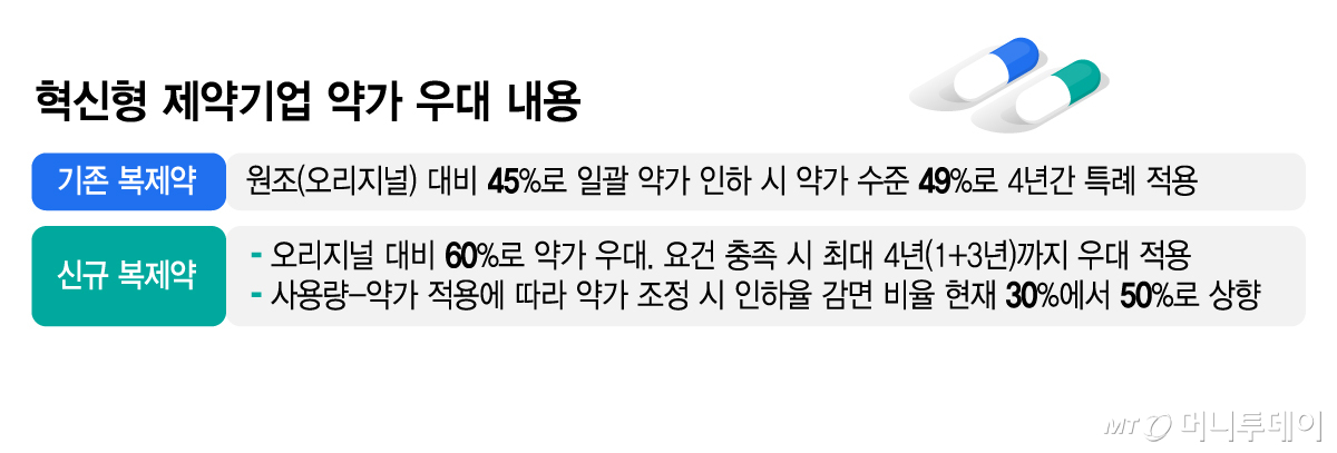 보건복지부는 지난달 약가인하를 핵심내용으로 하는 '국민건강보험 약가제도 개선방안'을 발표하면서 R&D(연구·개발) 비중이 높은 혁신형 제약기업은 약가를 우대해 신약개발을 도모할 수 있도록 하겠다고 밝혔다. 일반 기업의 복제약 가격은 오리지널(원조약) 대비 53.55% 수준에서 45%로 단계적으로 낮추지만 혁신형 제약기업은 이보다 4%포인트(P) 높은 49%의 약가를 4년간 부여키로 했다. 신규 복제약을 등재할 때도 혁신형 제약기업의 약은 오리지널 대비 60%로 최대 4년간 우대키로 했다. 이에 따라 혁신형 제약기업이 되면 약가인하에 따른 매출타격을 어느 정도 방어할 수 있다.