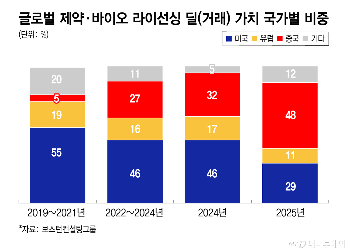 바이오 플랫폼 기술이나 파이프라인(신약후보물질) 기술이전은 실제로 생산된 제품을 대상으로 하는 게 아니라 관세 등 지정학적 리스크에서 비교적 자유롭다. 이에 중국은 최근 수년간 지속된 미중 갈등에도 꾸준히 글로벌 기술이전을 늘려왔다. 보스턴컨설팅그룹(BCG)에 따르면 전 세계 제약 바이오 라이선스 딜 가치에서 중국의 비중은 2019~2021년 5%에서 지난해 48%까지 크게 늘었다.