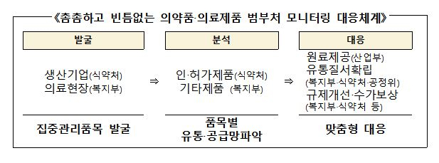 현재 △생산기업에 대해서는 산업부, 식약처가 원료 공급 및 생산상황을 모니터링하고 있고 △의료제품의 수요처인 의료기관 및 약국 등에 대해서는 복지부가 수급상황을 매일 모니터링하고 있다.