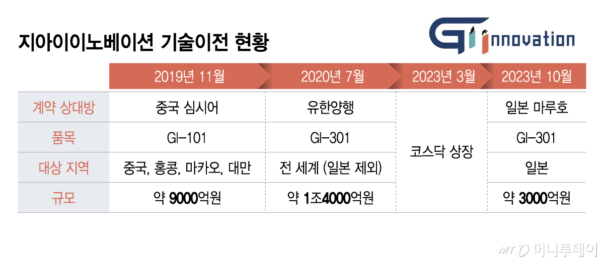 지아이이노베이션은 2017년 창립 이후 현재까지 총 3건, 약 2조6000억원 규모의 기술이전 성과를 냈다. 그 중에서 2023년 3월 코스닥에 상장한 후 체결한 계약은 1건이다. 해당 계약은 2023년 10월에 일본 마루호와 맺은 'GI-301'에 대한 일본 내 전용실시권에 대한 계약으로, 규모는 약 3000억원이다. 그로부터 약 2년6개월간 신규 기술이전 소식은 부재한 상황이다.