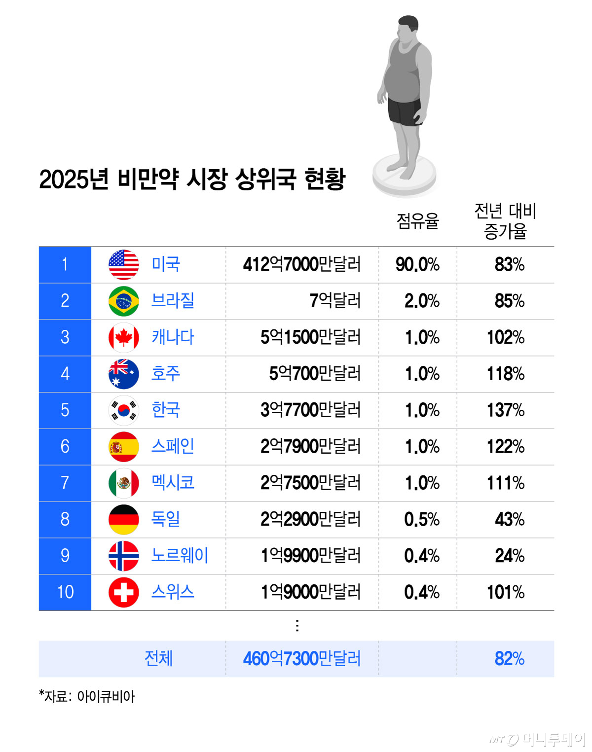 의약품시장조사기관 아이큐비아에 따르면 지난해 전 세계 비만치료제 매출은 전년보다 82% 증가한 460억7300만달러였다. 국가별로 미국이 412억7000만달러로 1위를 기록했고 한국은 3억7700만달러로 5위였다. 전년 대비 지난해 비만 시장의 증가율로 보면 상위 10개국 중 한국의 시장 성장률이 137%로 가장 높았다.