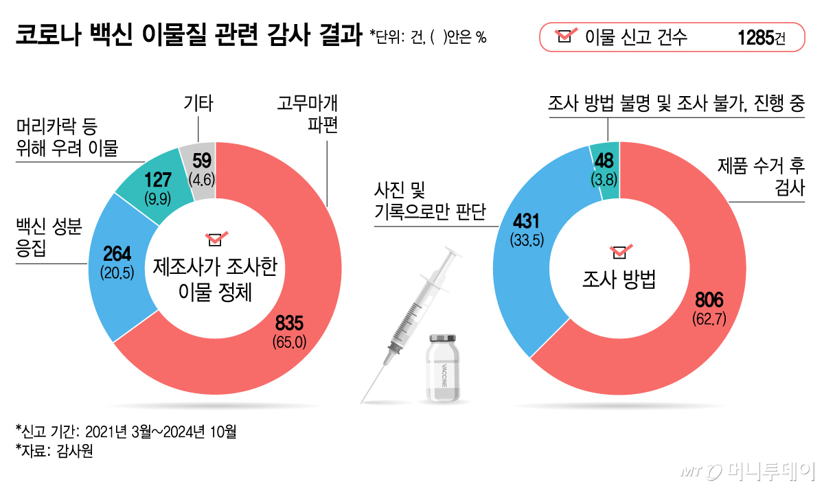 그러면서 "이물 신고된 1285건의 백신은 1건도 접종된 바 없으며, 해당 백신과 동일 제조번호의 백신도 조사결과 제품을 회수할 정도의 안정성 문제는 없는 것으로 나타났다"고 했다.