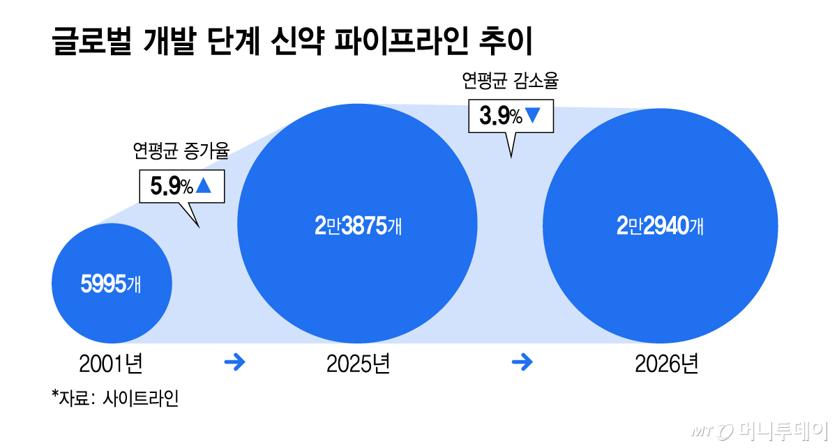 개발단계 의약품은 2001년부터 2025년까지 매년 증가해 5995개에서 2만3875개(연평균 5.9%)로 늘어났다. 하지만 최근 수년간 신약개발의 주축인 글로벌 제약사들의 전략변화가 파이프라인 증가정체로 이어진 것으로 분석된다.