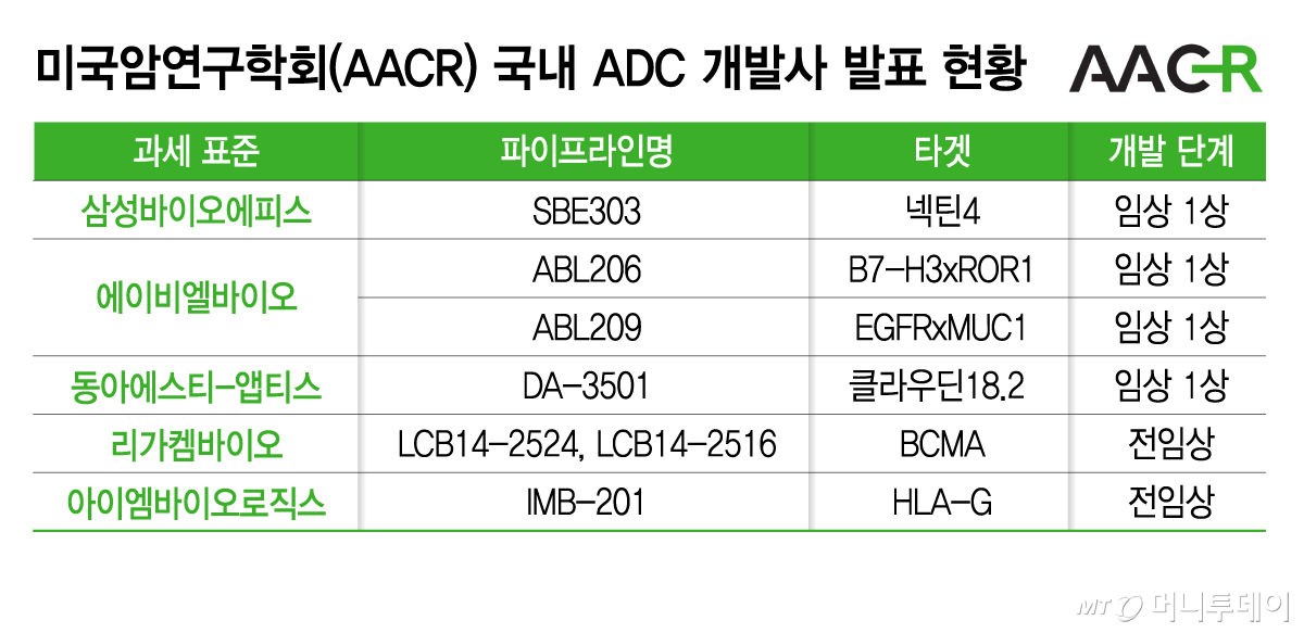 세계 최대의 암 학회 '미국암연구학회'(AACR)에서 리가켐바이오(188,800원 ▲600 +0.32%), 삼성바이오에피스, 에이비엘바이오(155,000원 ▼2,700 -1.71%) 등이 각사의 차세대 항체-약물 접합체(ADC) 개발 전략을 상징하는 첫 파이프라인(신약후보물질)의 전임상 연구 결과를 발표한다. 이들 파이프라인은 올해부터 임상 진입을 본격화해 약 3년 내 임상 1상 초기 데이터를 통해 가치를 입증하는 것이 관건이 될 전망이다.