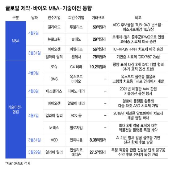 이밖에도 길리어드가 ADC 신약과 기면증 치료제를 보유한 독일 투불리스를 50억달러(약 7조4000억원)에 인수했다. 투불리스의 핵심 자산은 난소암 및 비소세포폐암 1b/2상 중인 'TUB-040'이다. ADC에서 난이도 높은 표적으로 분류되는 나트륨-인산염 공동수송체(NaPi2b)를 타깃하는 항암제다.