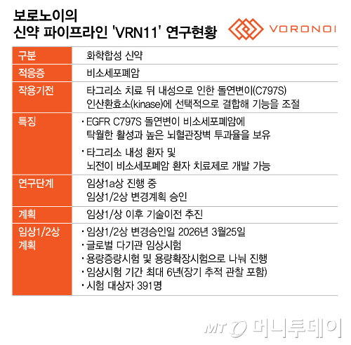 보로노이의 VRN11은 표피성장인자수용체(EGFR) 'C797S' 돌연변이 비소세포폐암(NSCLC) 치료제다. EGFR 비소세포폐암에 타그리소(Osimertinib)를 치료제로 사용할 때 발생하는 C797S 내성을 공략하는 약물이다.