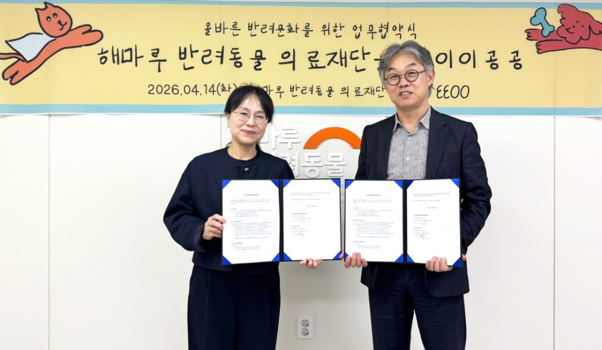 해마루 반려동물 의료재단(이하 해마루)과 주식회사 이이공공(이하 이이공공)이 반려동물 기부 문화 확산 및 동반 성장을 위한 업무 제휴 양해각서(MOU)를 14일 체결했다.