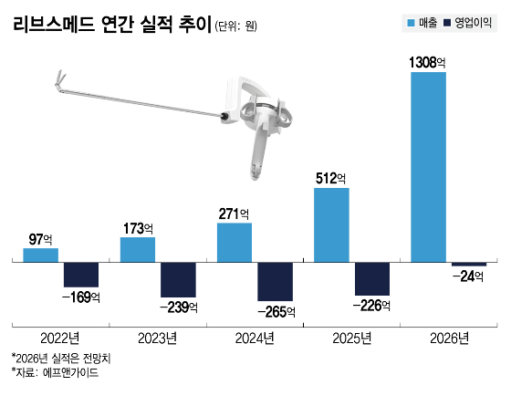 리브스메드는 지난해 512억원의 매출액을 기록하며 전년 대비 88.9%의 성장률을 보였다. 이는 지난해 12월 상장 당시 제시한 546억원에 근접한 수치다. 다만 영업손실은 226억원으로 전년(265억원) 대비 소폭 개선에 그쳤다. 상장 시 제시한 목표(영업손실 120억원)에도 크게 못 미치는 수치다.
