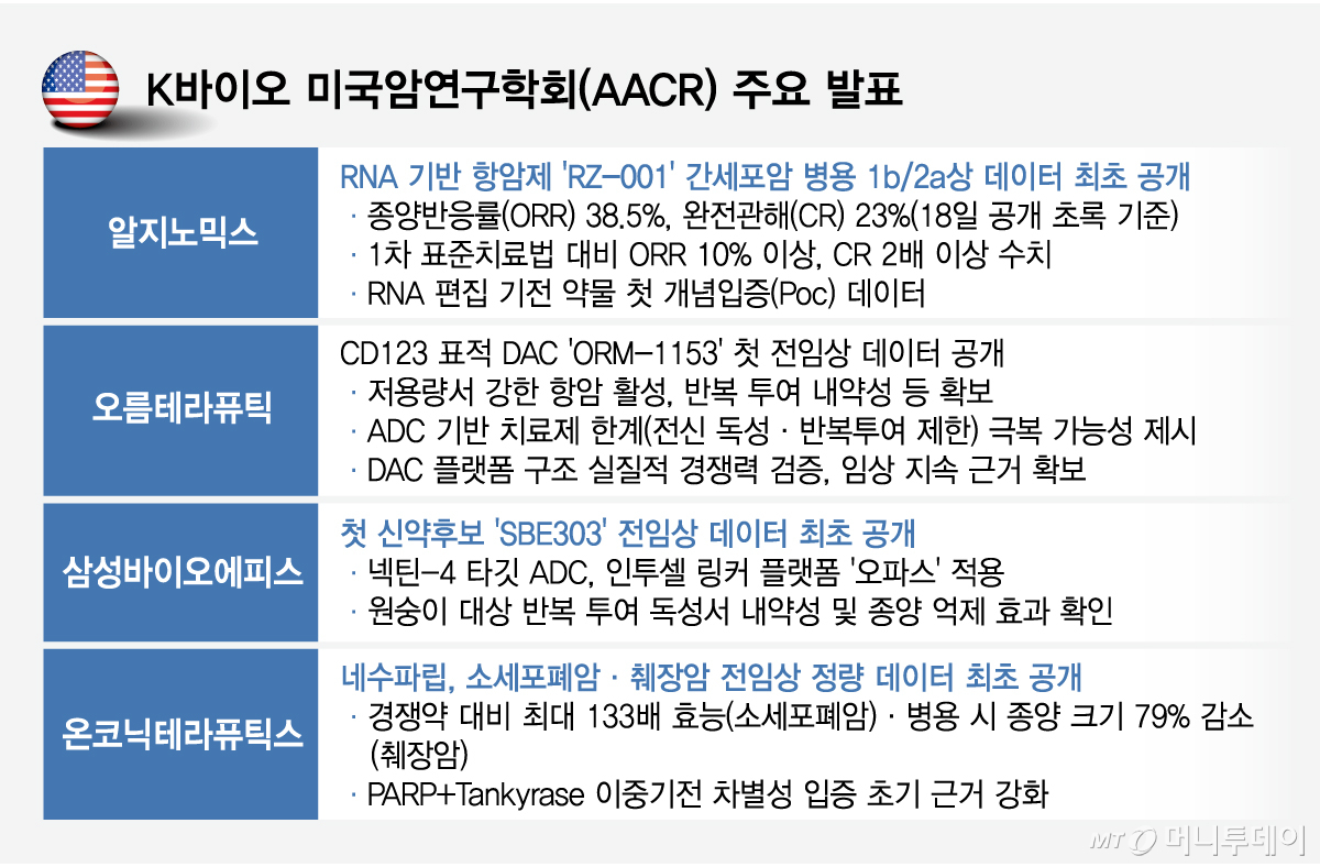 국내 바이오 기업들이 미국암학회 연례학술대회(AACR 2026)를 통해 주요 파이프라인(신약후보물질)의 최초 공개 임상 데이터를 연달아 발표했다. 차세대 플랫폼의 실제 치료 적용 가능성 검증과 기존 표준치료법 대비 우위를 기대할 수 있는 데이터라는 점이 주목받는다.