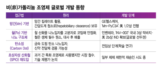 망간 기반 대표 주자는 GE헬스케어의 'Mn-PyC3A'로 임상 2상 단계다. 글로벌 임상 기준으론 속도가 가장 빠르지만, 망간 기반 품목이 과거 신경독성 우려로 시장에서 퇴출된 전례가 있다는 점이 극복해야 할 과제로 남아있다.
