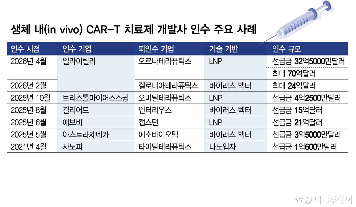 21일 업계에 따르면 일라이 릴리는 지난 20일(현지시간) 선급금 32억5000만달러(약 4조7760억원), 최대 70억달러(약 10조원) 규모에 생체 내 CAR-T 치료제 개발사 켈로니아 테라퓨틱스를 인수하는 최종 계약을 체결했다. 지난 2월 또다른 생체 내 CAR-T 치료제 개발사 오르나 테라퓨틱스를 최대 24억달러(약 3조5000억원) 규모에 인수한 지 약 2개월만이다.