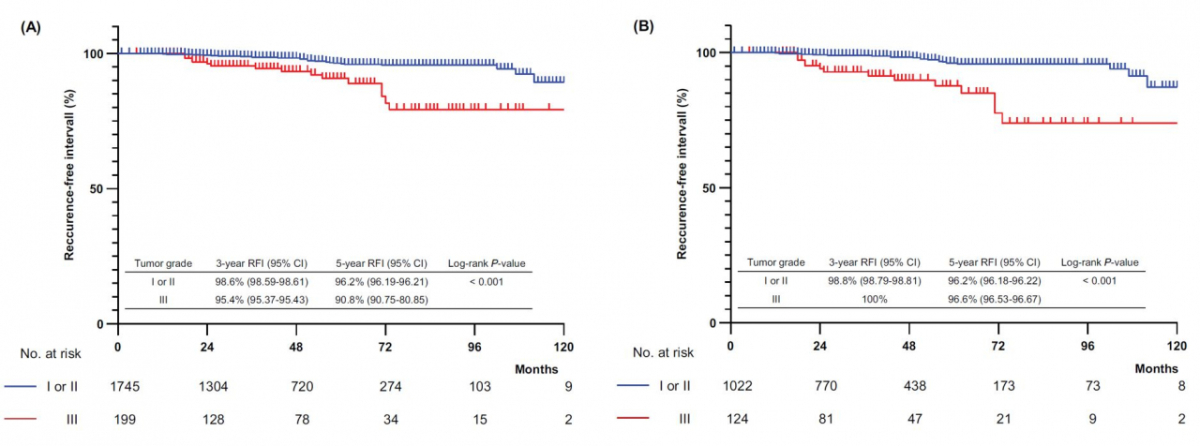 연구 결과, 전체 환자군에서 조직학적 등급이 높을수록 재발을 겪지 않고 지내는 기간(RFI : recurrence-free interval)이 짧아지는 것으로 확인됐다(P < 0.001). 이 현상은 아직 폐경을 겪지 않은 50세 이하 환자군에서는 고등급 환자들이 저등급 및 중간 등급 환자보다 재발 없이 지내는 기간이 확연하게 짧았다. 50세를 초과한 환자군에서는 고등급 환자들이 저등급 또는 중간 등급 환자들과 큰 자이를 보이지 않는 특징이 관찰됐다.
