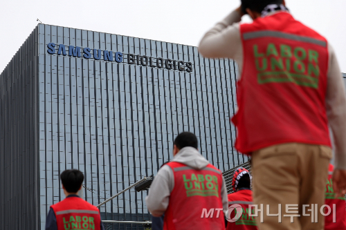 ![[인천=뉴시스] 홍효식 기자 = 삼성바이오로직스 창사 이래 첫 노조 단체행동이 열린 22일 인천 연수구 삼성바이오로직스 송도 사업장 모습. 2026.04.22. /사진=홍효식](https://thumb.mt.co.kr/cdn-cgi/image/f=avif/21/2026/04/2026042308542283672_1.jpg)