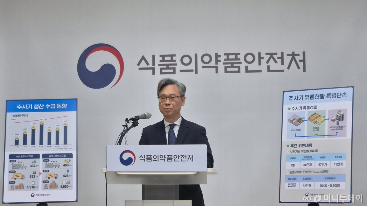 김명호 식품의약품안전처 의료기기안전국장은 24일 서울 양천구 서울지방식약청에서 주사기 매점매석 점검 결과 발표 브리핑을 열고 "전국 주사기 판매업체들을 특별 단속한 결과, '물가안정에 관한 법률'에 따른 주사기 매점매석금지 고시를 위반한 32개 업체를 적발했다"고 밝혔다.