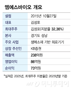 엠에스바이오는 2015년 10월 설립한 뒤 무세포 동존진피와 치과용 동종골 이식재, 안과용 양막이식재 등을 출시했다. 각막과 뼈, 피부 등 인체의 손상된 조직을 복원하고 치료하는 생체소재가 대표 제품이다. 또 콜라겐사용조직보충재와 생체재료이식용뼈, 창상피복재 등 의료기기도 개발했다. 본사는 경기도 성남에 있다.