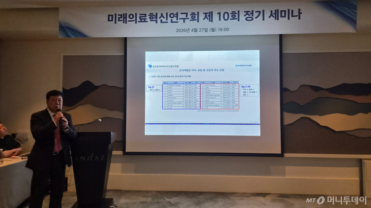 홍정기 한국제약바이오협회 기획보험본부장은 27일 안다즈 서울 강남에서 '대한민국 제약산업 어디로 가나'를 주제로 열린 미래의료혁신연구회 제10회 정기 세미나에서 "제약바이오산업의 기술패권 경쟁이 심화하고 글로벌 제약바이오 VC(벤처캐피탈) 투자가 침체됐다"고 말했다. 이어 "한국의 제약바이오산업은 임상 역량은 뛰어나지만, 반도체 등 다른 산업에 비해 굉장히 열악하다"고 덧붙였다.