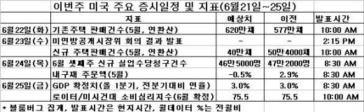 이번주 발표되는 지표는 2건의 5월 주택관련 지표, 5월 내구재 주문 등이 있다. 이중 주택지표는 신규 주택 착공 건수 등 선 발표된 지표가 실망감을 안기며 기대를 낮춘 상태여서 전월비 크게 하락한 것으로 나와도 파괴력은 없을 전망이다.