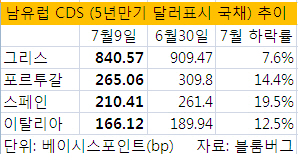◇국채CDS ↓..은행 채권발행 ↑= 일단 국가부도 정도를 보이는 신용디폴트스와프(CDS)의 하향세가 뚜렷해진 양상이다. 지난 5월6일 274.57bp로 고점을 찍었던 스페인 5년물 국채 CDS는 지난 9일 210.40을 기록했다. 포르투갈 CDS는 300~350bp에서 움직였으나 같은날 265.05까지 떨어졌다.