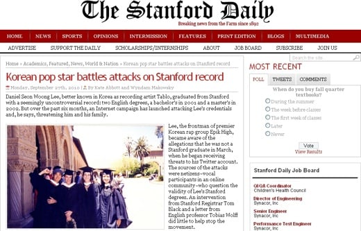 미국 스탠퍼드 대학교 교내신문인 '스탠퍼드데일리(The Standford Daily)'는 타블로가 스탠퍼드 학력 때문에 네티즌들로부터 공격을 받고 있다며 이를 관심 있게 보도했다. 타블로가 보낸 이메일의 내용도 일부 공개했다.