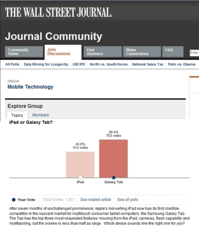 월스트리트저널 온라인사이트가 지난 14일부터 진행중인 갤럭시탭과 아이패드를 대상으로 한 선호도 온라인 투표에 30일 오전 10시 현재 총 1267명이 참여한 가운데 갤럭시탭의 선호도가 59.4%(753명)로 40.6%(514명) 선호도를 보인 아이패드를 약 19%포인트의 차이로 앞서고 있다.