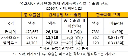 이어 2013년엔 경제연합을 출범하기로 했다. 이 때 3개국 외에 잠재적 회원국으로 여겨지는 우크라이나, 키르기스스탄, 타지키스탄이 합류하면 총 6개국에 인구 2억2300만명을 포괄하게 된다.