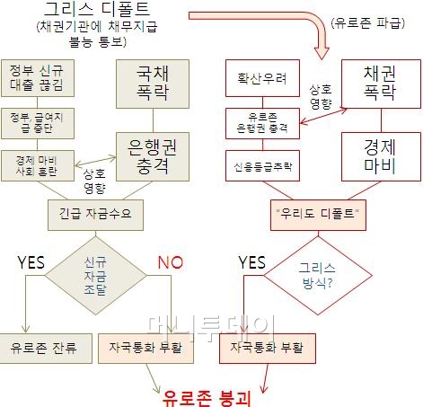 ◆디폴트→경제회생 위해 유로존 이탈= 이 경우 그리스 정부는 당장 급한 자금을 조달하지 못해 공공부문 급여를 지급하지 못한다. 일부 사회보장 장치도 중단되고 경제는 더욱 어려움에 빠진다.