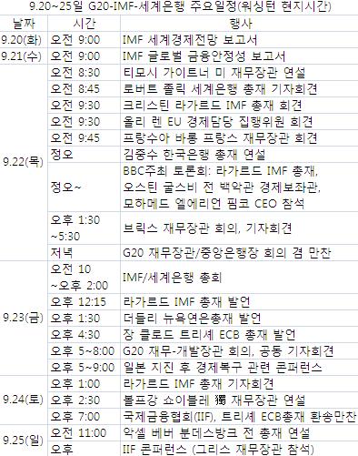 토요일인 24일 라가르드 총재는 IMF 위원회 회의를 끝낸 뒤 오후 1시에 회견을 갖는다. 오후 2시30분 볼프강 쇼이블레 독일 재무장관이 국제금융협회(IIF) 회의에서 연설을 한다. IIF는 다음달로 임기를 마치는 트리셰 ECB 총재를 위해 오후 7시 만찬을 연다.