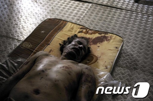 AP통신에 따르면 바지만 입은 채 알몸을 드러낸 카다피의 시신은 야채시장 냉동창고 바닥 매트리스 위에 놓여 있는 상태다. 또 카다피의 머리 왼쪽과 가슴 한복판, 배에는 총상 흔적이 선명했다.