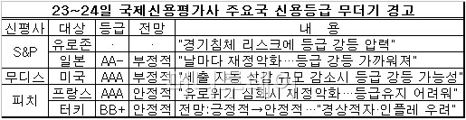 스탠더드앤드푸어스(S&P), 무디스, 피치 등 세계 3대 신평사는 23일 미국과 프랑스, 유로존(유로화 사용 17개국)의 신용등급 강등 가능성을 거론한데 이어, 24일엔 일본의 신용등급 하향 조정 가능성까지 끄집어냈다.