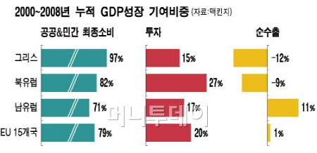 니콜라오스 게오르기코폴로스 이코노미스트는 "유로존 가입 전 15%를 웃돈 인플레가 이후 5% 정도로 뚝 떨어지면서 시중에 돈이 넘쳐나자 너도나도 고급 수입차로 바꾸고, 주택을 샀다"고 말했다. 민간의 최종 소비 비중은 90%를 웃돌며 유럽 국가 중 최고 수준을 나타냈다. 심지어 외화획득의 핵심 산업이었던 관광업까지 내수에 의존할 정도였다.