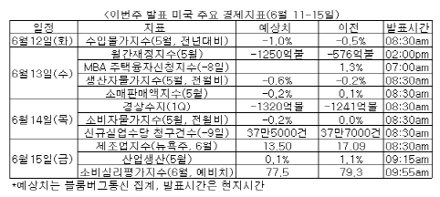 미국에선 가장 중요한 지표는 13일 소매판매액지수와 14일 신규실업수당 청구건수이다. 5월 소매판매액지수는 이전치 0.1% 상승을 밑도는 0.2% 하락이 예상된다. 신규실업수당 청구건수는 이전치 37만7000건을 하회하는 37만5000건이 예상된다.