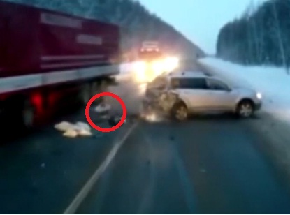 러시아 도로 위에서 한 살배기 아기가 차량 추돌사고 후 아스팔트 위에 떨어져 마주오던 트럭에 치일 뻔 했으나 가까스로 사고를 면하는 장면이 포착돼 화제다.