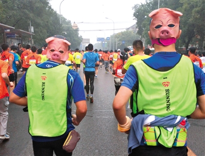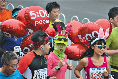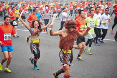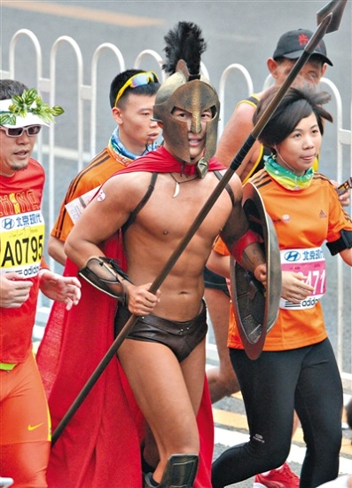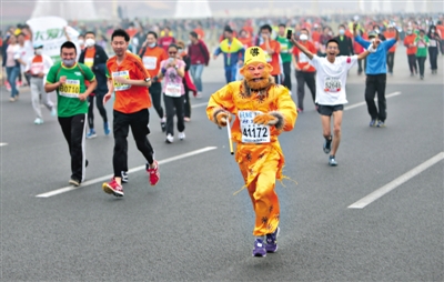 한편, 매년 일부 참가자들의 기발한 코스프레가 대회의 또다른 볼거리인데 올해는 ‘서유기’에 등장하는 손오공, 저팔계 탈을 쓴 사람, 선녀 복장을 한 사람, 원시인을 흉내 낸 사람, 로마 검투사 코스프레를 한 사람 등 다양했다. 그들은 대회참가자들의 이목을 끌면서 42.195km를 신나게 달렸다.