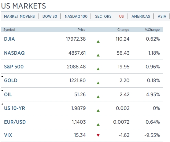 다우지수 역시 전날보다 무려 110.24포인트(0.62%) 오른 1만7972.38로 마감했다. S&P500 지수도 19.95포인트(0.96%) 상승한 2088.48포인트를 기록했다. 두 지수 모두 올해 최고치 수준이다.