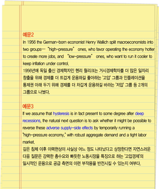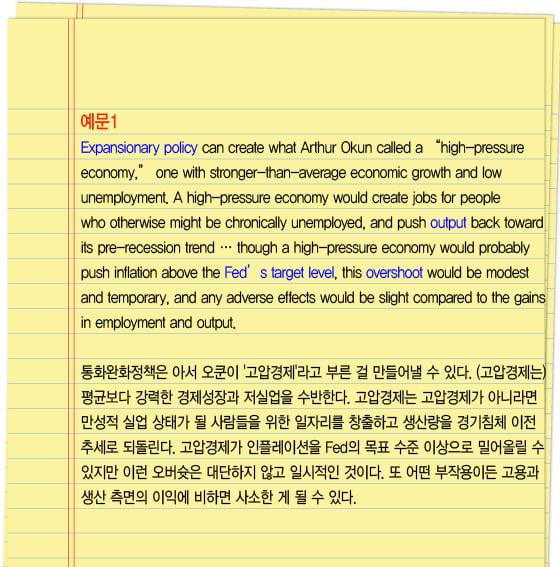 미국 싱크탱크인 예산정책우선센터(CBPP)는 지난해 3월에 낸보고서에서 오쿤의 고압경제를예문1과 같이 설명했다.