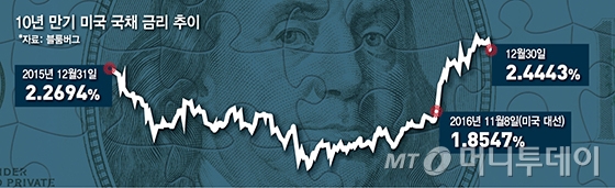 기세등등했던 채권 강세장은 트럼프 당선 이후 흔들리기 시작했다. 증시 호황과 FRB의 금리인상 전망이 맞물려 국채 투매가 일어났다. 10년 만기 미국 국채 금리는 지난해 말 2.44%로 미국 대선 이후 0.59%포인트 뛰었다.
