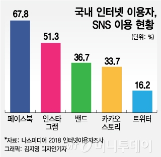 KT 디지털 미디어렙 나스미디어가 지난해 12월19일부터 지난 1월3일까지 SNS사용자 2000명을 대상으로 조사한 결과 페북 사용률은 67.8%로 전년 동기(69.2%)보다 1.4%포인트 하락했다.