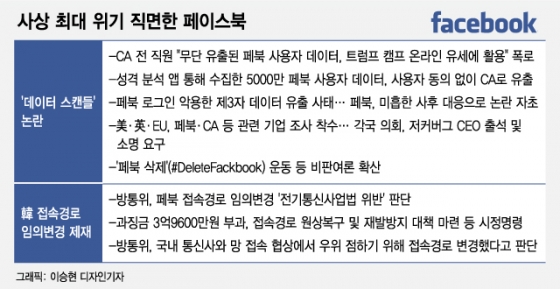 세계 최대 SNS 서비스 페이스북(이하 페북)이 사상 최악의 위기국면를 맞고 있다. 5000만 페북 사용자 정보가 미국 정치 선거에 무단 악용됐다는 '데이터 스캔들' 의혹으로 파문이 일파만파 확산되는 가운데, 이번에는 한국 정부로부터 플랫폼 시장 지배력을 악용한 갑질 혐의로 과징금 제재까지 받았다. 페북이 플랫폼 영향력을 악용한 사례로 해외 정부로부터 제재를 받기는 이번이 사상 처음이다.
