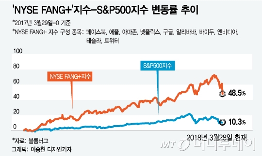 페이스북 애플 아마존 넷플릭스 구글 등 뉴욕증시 10대 기술주의 주가를 반영하는 'NYSE(뉴욕증권거래소) FANG+ 지수'는 2016년 초 저점에서 이달 중순 역대 최고치까지 280% 넘게 뛰었다. 닷컴버블이 터지기까지 2년간 나스닥 상승세를 압도한다. 하지만 최근 이 지수가 급락하면서 경계감은 공포로 바뀌고 있다. 월스트리트저널(WSJ)은 글로벌 증시에서 기술주 비중이 과도하게 커져 공포감이 더 크다고 지적했다.