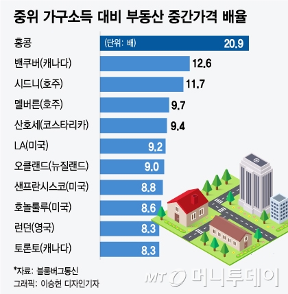 블룸버그통신은 시장조사업체 데모그라피아의 통계를 인용해 지난해 기준 홍콩의 중위 가구소득 대비 부동산 중간가격이 20.9배로 전세계 도시 중 1위라고 전했다. 2017년 이 수치는 19.4배였다.