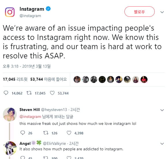인스타그램 역시 "이 상황이 짜증나는 것을 안다"면서 수정 작업을 하고 있다고 트위터에서 알렸다.