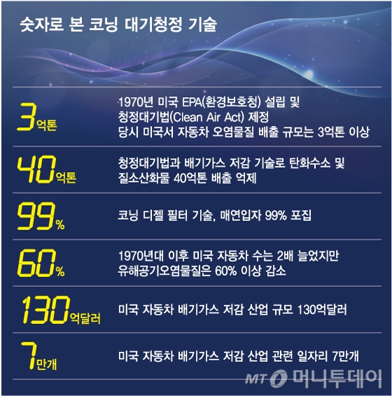 "GDI 엔진 차량을 가진 운전자들은 성능과 연비에 대해 상당히 만족할 것이다. 하지만 GDI 엔진은 지름 2.5㎛이하의 초미세먼지(PM2.5) 배출이 늘어난다는 특징이 있다. 디젤 엔진의 경우엔 이미 많은 국가에서 배기가스 필터 장착을 의무화했지만, 가솔린 엔진은 상대적으로 그렇지 못하다. 가솔린 엔진에도 배기가스 필터 장착을 의무화할 필요가 있다. 이 경우 코닝과 같은 필터 업체들 입장에선 미세먼지를 효과적으로 걸러내면서도 엔진 성능을 저하시키지 않는 기술을 확보하는 게 중요하다."