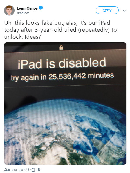 미국 뉴욕에 거주하는 연구원 에반 오스노스는 지난 주말, 자신의 아이패드가 2553만 6442분, 대략 48년 후에나 잠금 해제 가능하다는 사실을 발견했다. 오스노스는 자신의 트위터에 비활성화된 아이패드 스크린 사진을 올리며 "거짓말처럼 보이겠지만, 제 3살 아들이 (수 차례) 잠금을 풀려고 했던 제 아이패드" 라고 밝혔다.