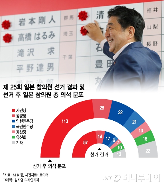한편 아베 정권은 선거에선 이겼지만 자민당이 최우선 과제로 꼽았던 개헌을 위한 필요 의석수 확보에는 실패했다. 개헌 발의에는 164석이 필요하지만 NHK에 따르면 여당 측은 유신회 등 우호 세력을 모두 합쳐도 160석을 차지하는 데 그쳤다.