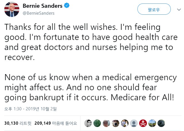 샌더스 의원은 수술 후 자신의 트위터에 "지금 몸상태는 좋다"면서 자신이 주장해온 의료보험의 중요성을 언급하며 자신의 건강문제를 기회로 활용하려 했다. 그는 두 번째 문단에 "언제 응급 의료를 받을지 아는 사람은 없다. 누구도 이 때문에 파산을 해선 안 된다"고 적고, "모두를 위한 의료보험!"이라고 강조했다.