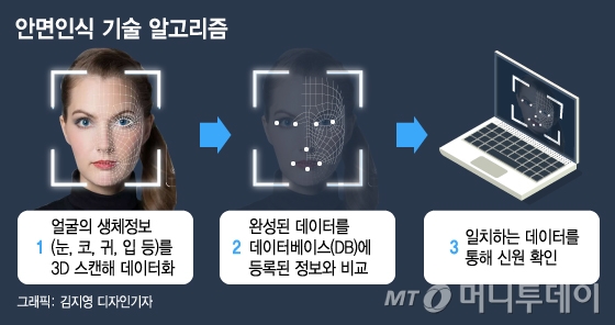 ◇AI 기술과 결합 "측면 봐도 정면 알 수 있다…얼굴인식 어디까지?=안면인식 기술이 최근에는 AI(인공지능)와 결합해 강력한 생체 인식 기술로 위력을 떨치고 있다. 이 경우 단순 신원 확인 수단을 넘어 CCTV(폐쇄회로 텔레비전) 등 공공 카메라를 통해 특정인의 행적을 자동으로 추적하는 수준까지 진화했다는 것이 업계의 귀띔이다.