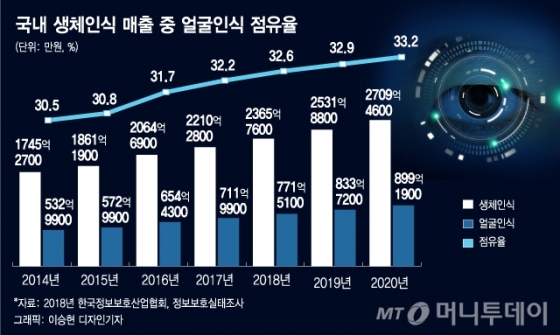 한국정보보호산업협회는 국내 얼굴인식 시장 규모가 2020년에는 900억 원대로 성장할 것으로 예측했다. 미국 시장조사업체 AMI는 세계 생체인증 시장 규모가 2020년 333억 달러(약 39조원)로 증가할 것으로 전망하고 있다.